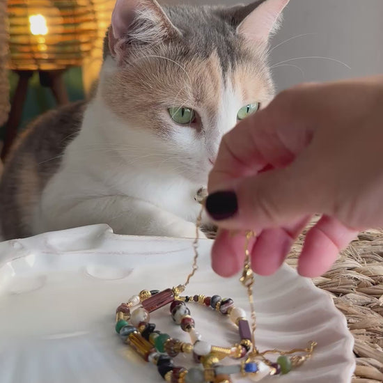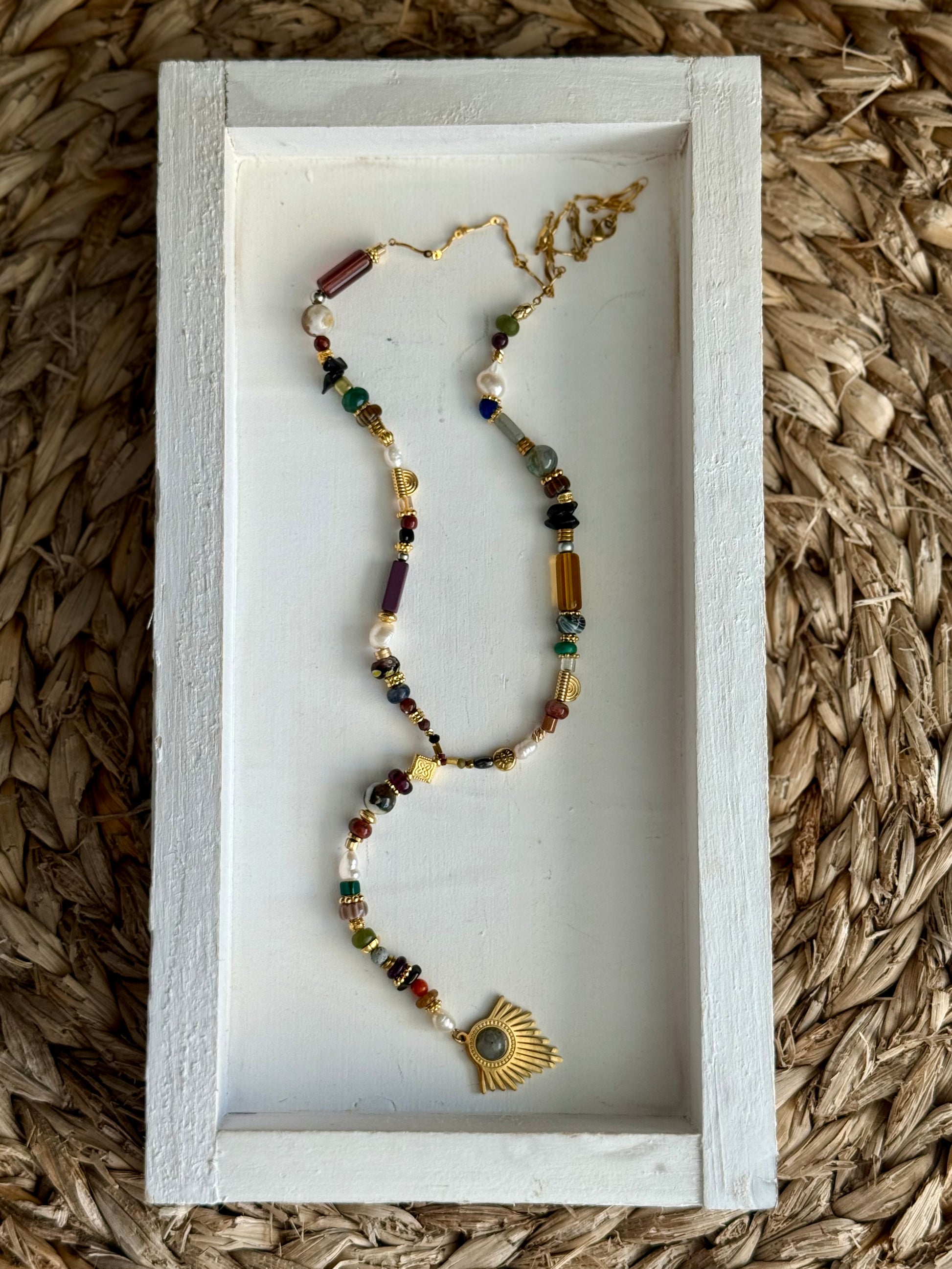 A modern take on the classic rosario style — handmade with a vibrant mix of semiprecious beads, freshwater pearls, and 24k gold-plated accents. Finished with an ethnic-inspired gold-plated pendant that adds a touch of boho charm to any look.